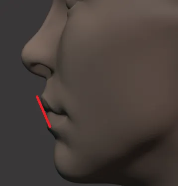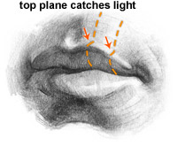- The upper lip is forward of the bottom, and is a downfacing plane. Light should catch the “lip” of the lip, not the lip.