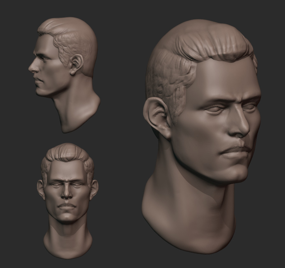 2/4/25: ~2hrs First male head session. Stayed extremely low density for an extremely long time. Struggled at first with confidence in the low-poly forms, but trusting in the process brought it to a place I’m extremely happy with. Tried to use grab as much as possible but .003 and lower Clay building is so important for subtle changes. Worried about speed…