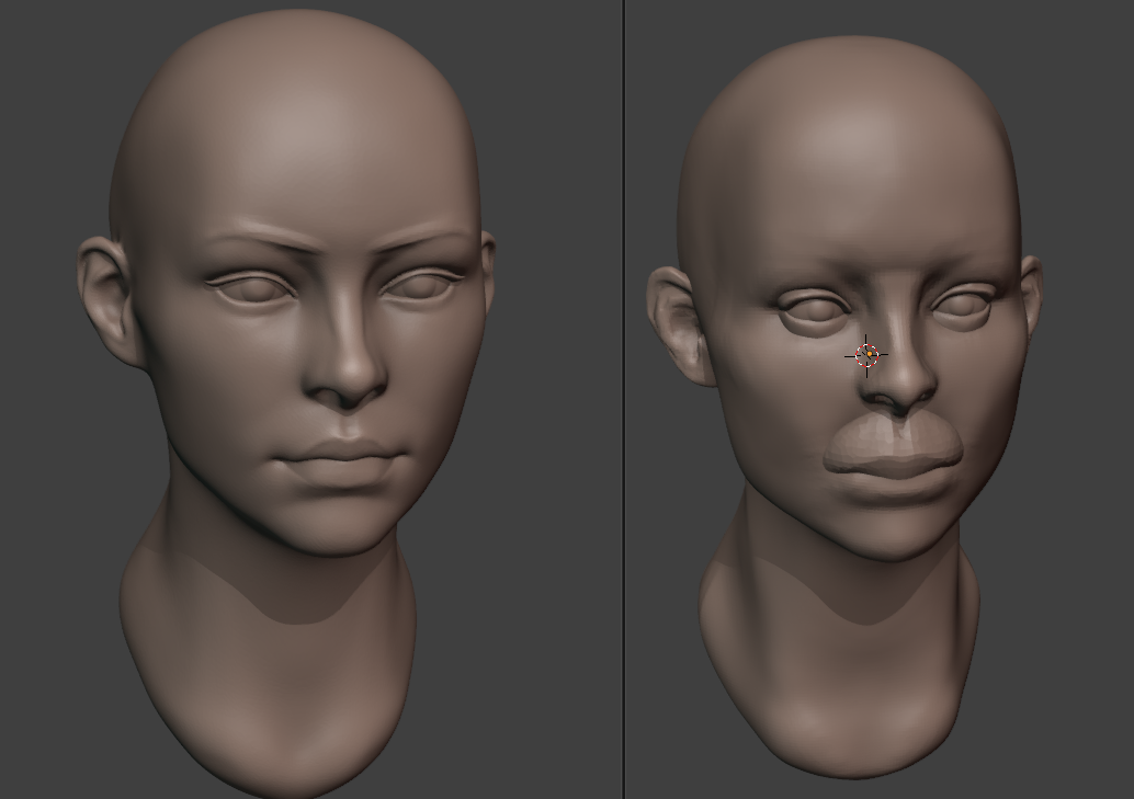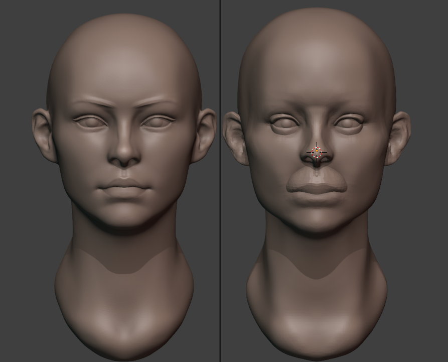 - It may soon be time to merge the lids. Before doing this, really consider how they sit in the face. Currently I think there is not enough form around the bottom lip, giving it a really thick appearance. Gently push the forms up to thin them out.